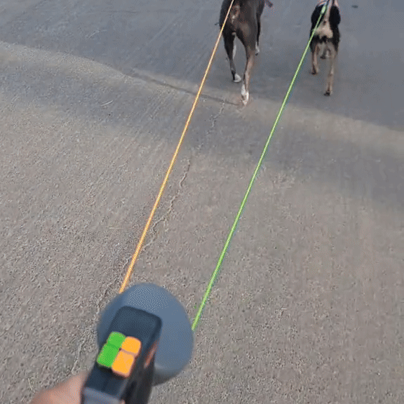 āļøColor-Coded Stop Buttons: Each lead is color-coded with matching stop buttons, allowing you to easily manage each dog individually. Simply press the corresponding button to stop one dog while letting the other roam.